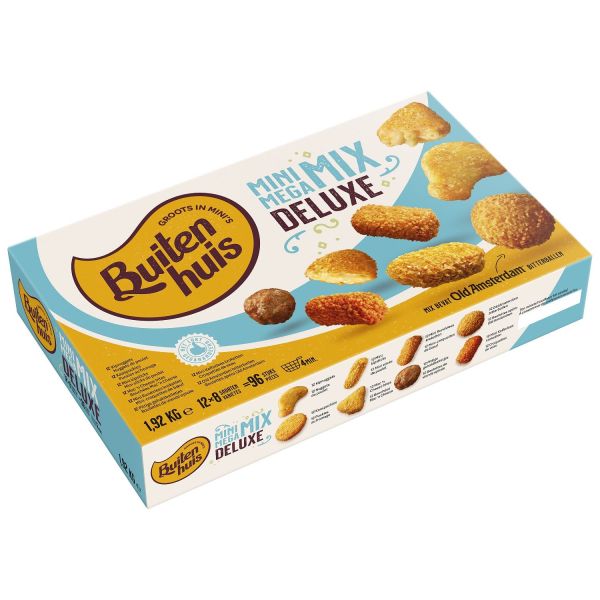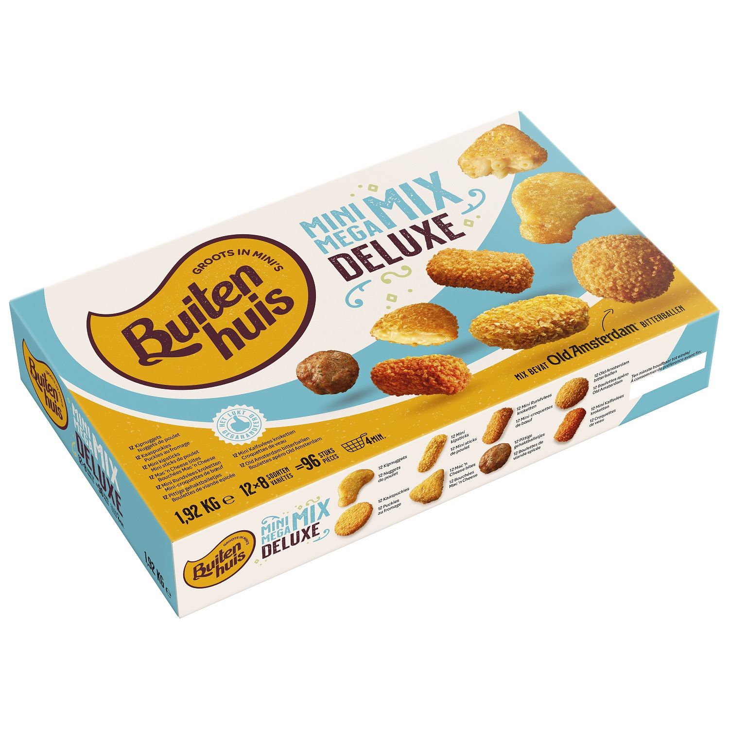 De Mini Mega Mix Deluxe is gemaakt voor de momenten waarop je echt wilt uitpakken. Deze mix bevat bijzondere hapjes, 12 stuks per soort à 20 gram, zoals de Old Amsterdam bitterbal, een mini kalfsvleeskroket en een Mac ‘n Cheese bite. Of je nu een verjaardag, borrel, bedrijfsfeest of groot gezelschap hebt: met deze mix lukt het altijd.