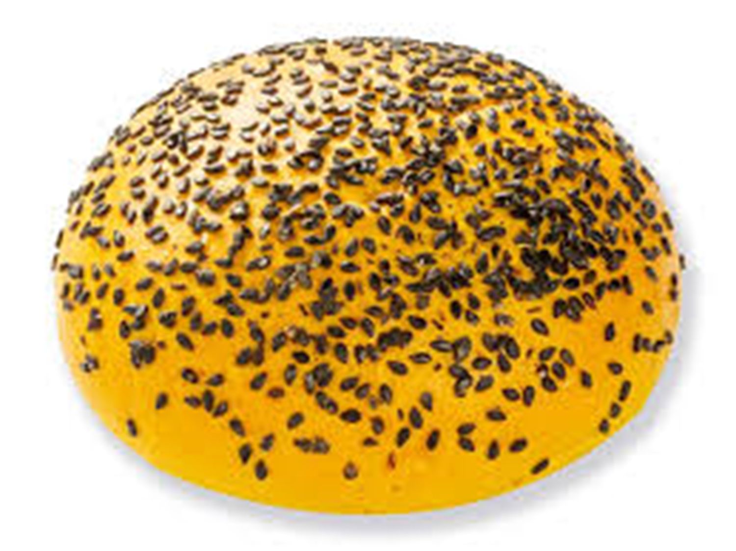 Wit tarwehamburgerbun met currypoeder en een topping van zwart sesamzaad.