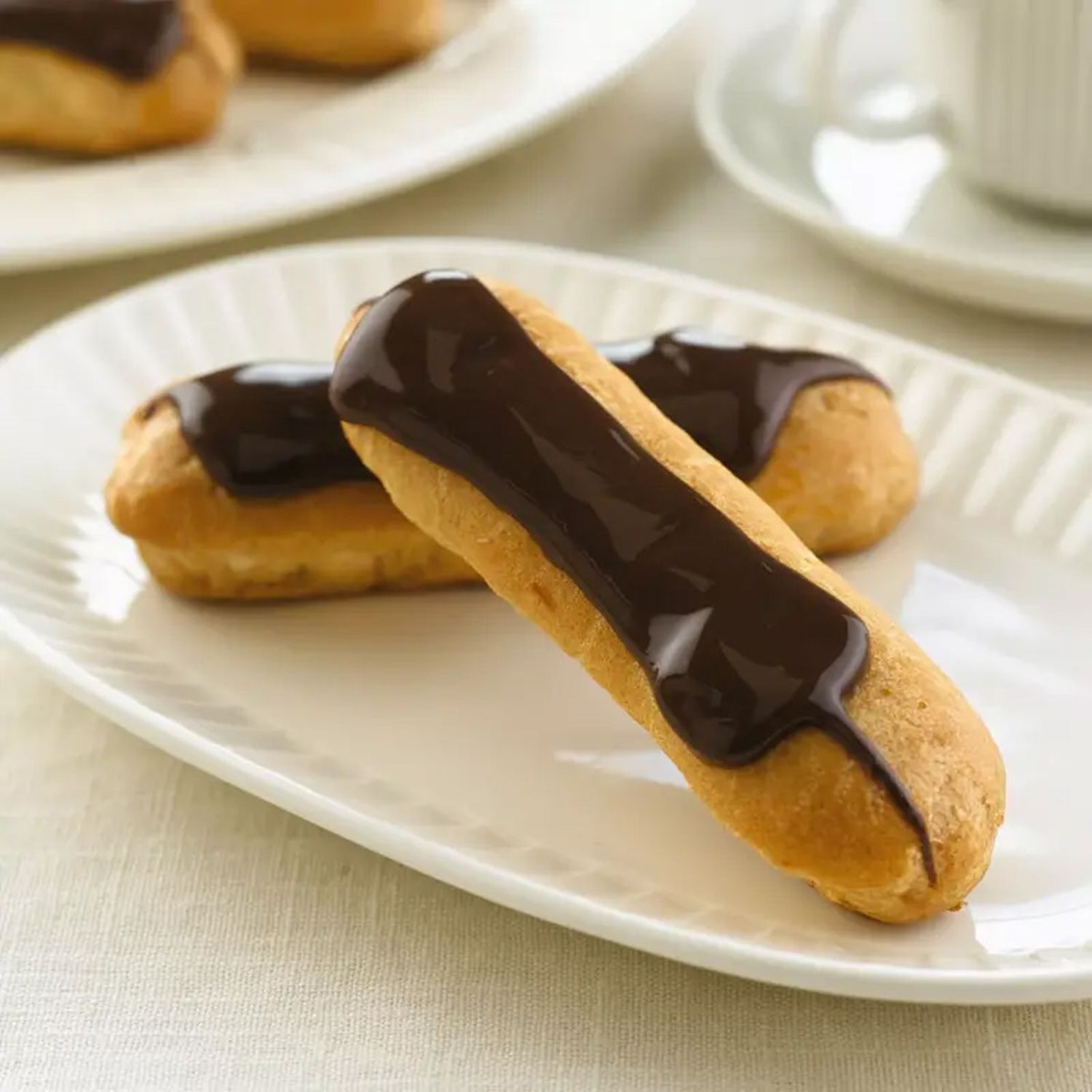De gevulde grote éclair uit het assortiment Zoete specialiteiten en desserts (Drooggebak) van BANQUET D'OR® is klaar om te serveren.