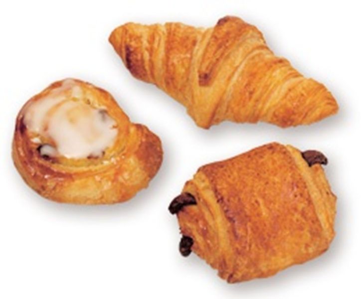Assortimentsdoos met ieders favoriete mini viennoiseries: 45 minicroissants (23% boter), 45 chocoladebroodjes (20% boter) en 45 rozijnenkoeken (13% boter) met vanillecrème (percentage in volledig recept).
