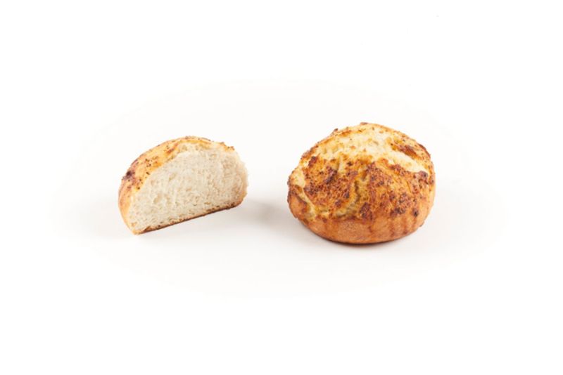 Tarwebroodje met een karakteristieke, gecraqueleerde korst en een vochtig, luchtig kruim. Bedekt met een pasta van plantaardige olie met zeezout en zwarte peper, verrijkt met aardappelvlokken en yoghurt als geheim ingrediënt voor een frisse smaak. Op steen gebakken.