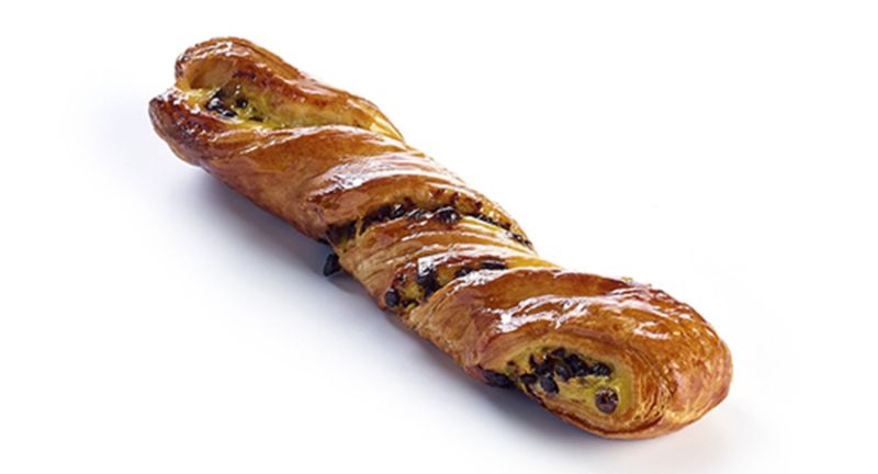 Getoerd gerezen deeg, gevuld met vanillecrème en veel stukjes echte Belgische donkere chocolade. Gemaakt met 11,5% boter (percentage in volledig recept).