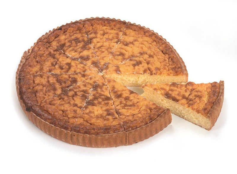 Diepgevroren gebakken rijsttaart en voorgesneden in 10 porties. Een gistdeeggebak gevuld met een rijstbereiding.