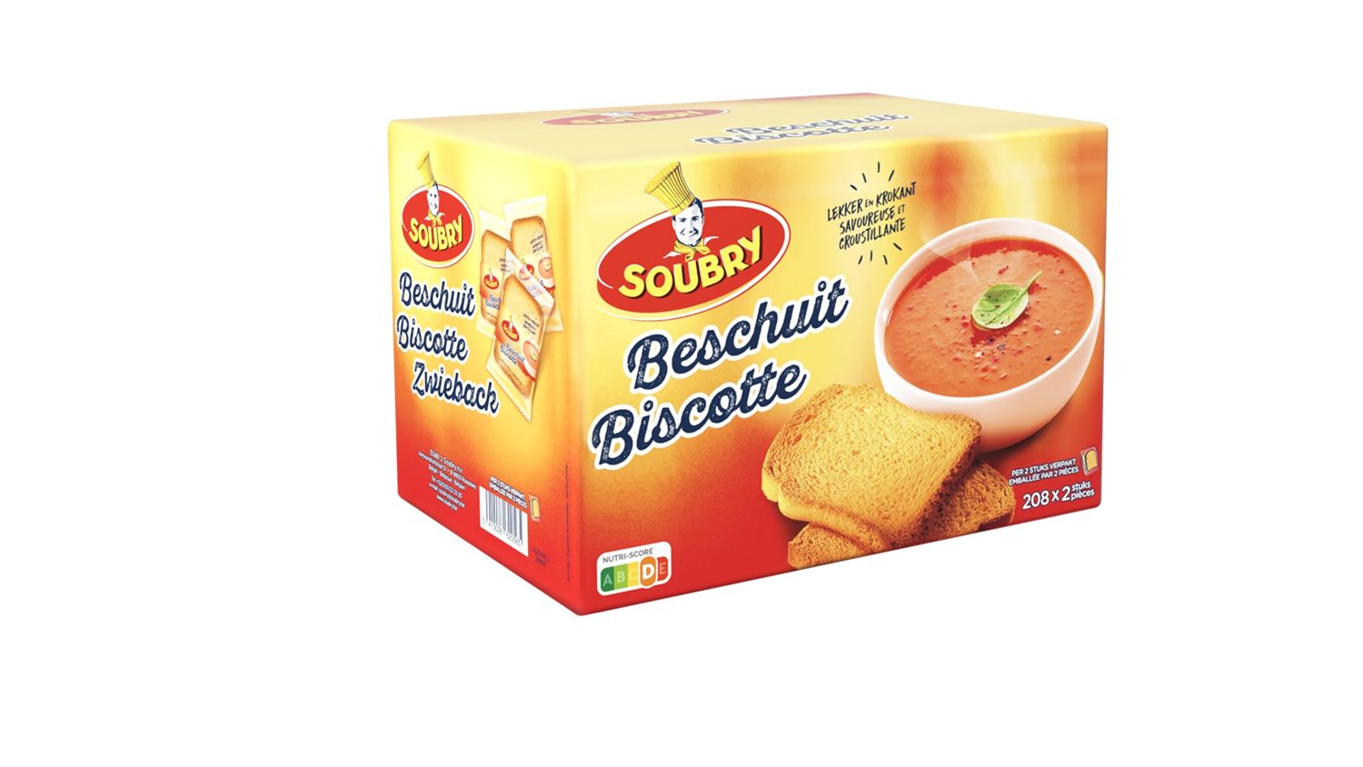 Beschuiten, ze bestaan in vele vormen en smaken. Bovendien produceren wij beschuiten onder 2 verschillende merknamen: Soubry en Anco! De Soubry beschuiten zijn eerder bedoeld voor professionele doeleinden. Dit zijn de normale natuur beschuiten met vierkante vorm. We verpakken ze in grote dozen van 208 x 2 stuks en in dat opzicht zijn ze dus geschikt voor sportclubs, sportcafetaria’s, etc.