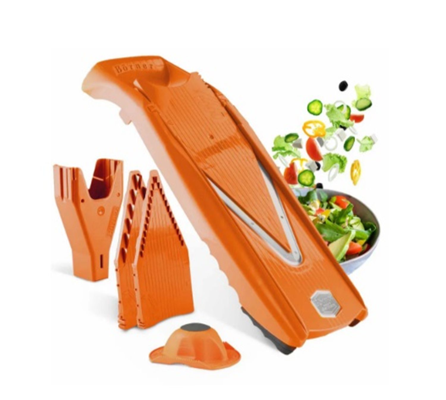 De keuken mandolines van Börner zijn duurzaam en gaan jaren mee. Juliennereepjes en blokjes zullen niet langer een probleem vormen, net als plakjes voor gerechten als tomatencarpaccio. Inhoud een mes in V-vorm een inschuifplaat zonder messen voor schijfjes (4 standen) een inschuifplaat met messen van 7 mm dikte een inschuifplaat met messen van 3,5 mm dikte (reepjes of brunoise) beschermkap Kenmerken 10 verschillende snijmogelijkheden met maar één apparaat: de V5 PowerLine groentenmando